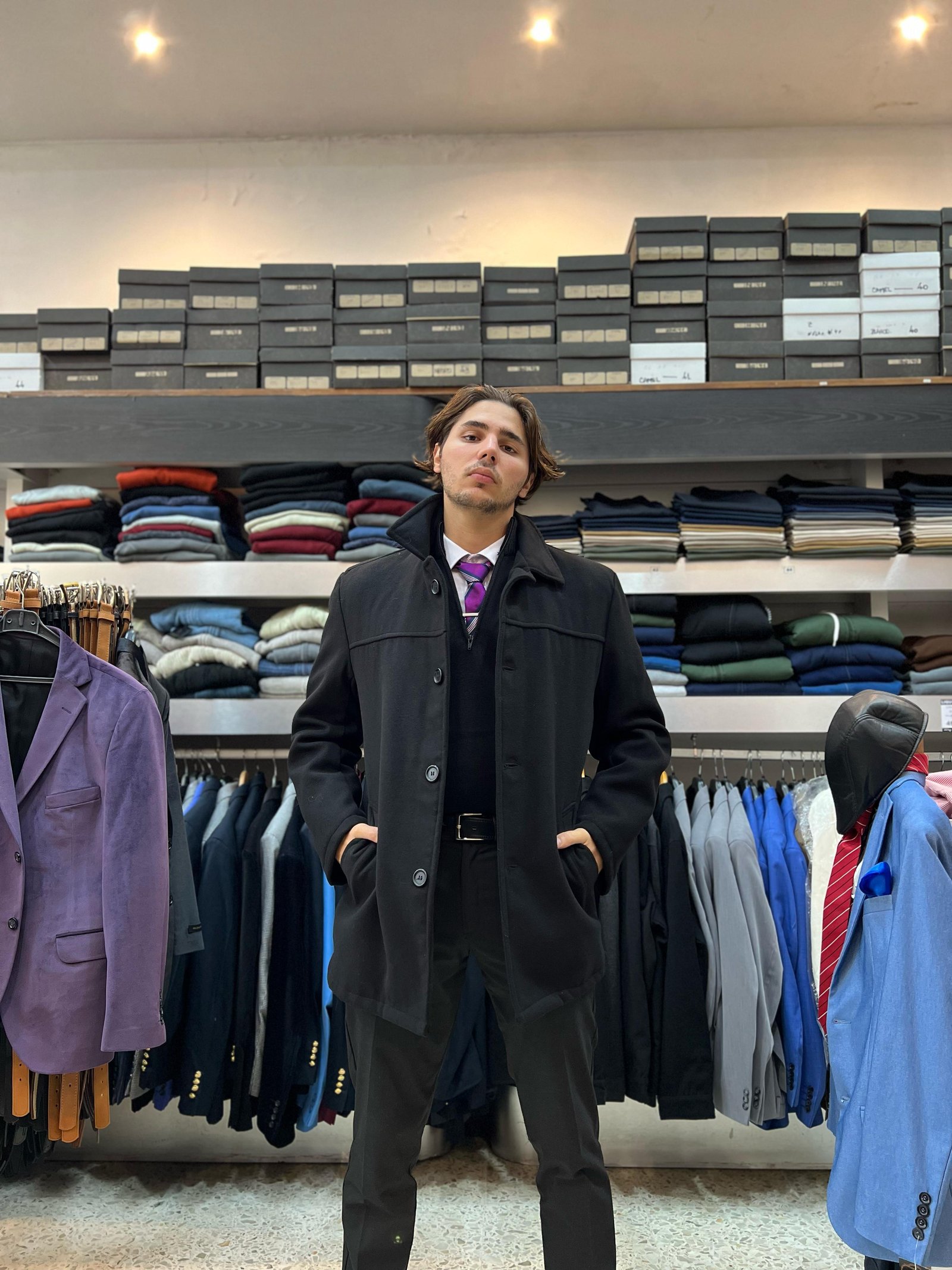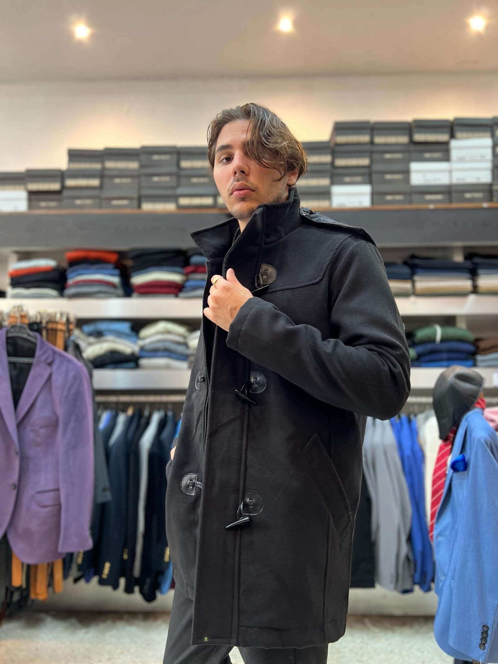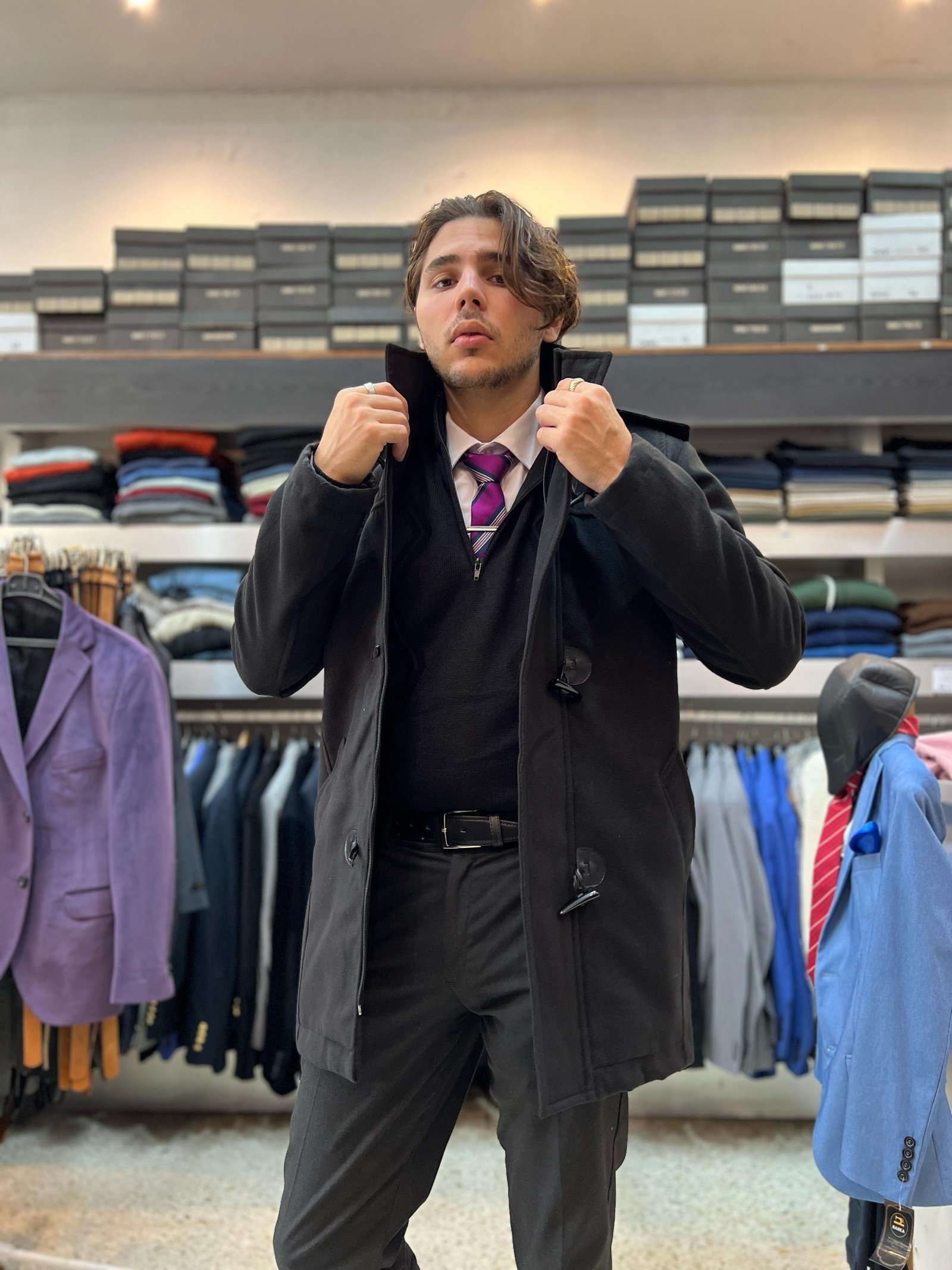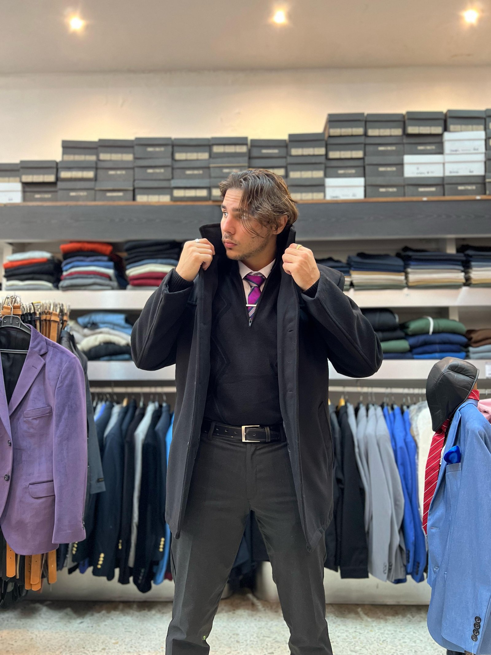 Abrigo negro clásico para hombre, ideal para sumar abrigo, elegancia y versatilidad en los meses fríos. Disponible en Bruno’s Rosario con asesoramiento personalizado y muy buena presencia para vestir.