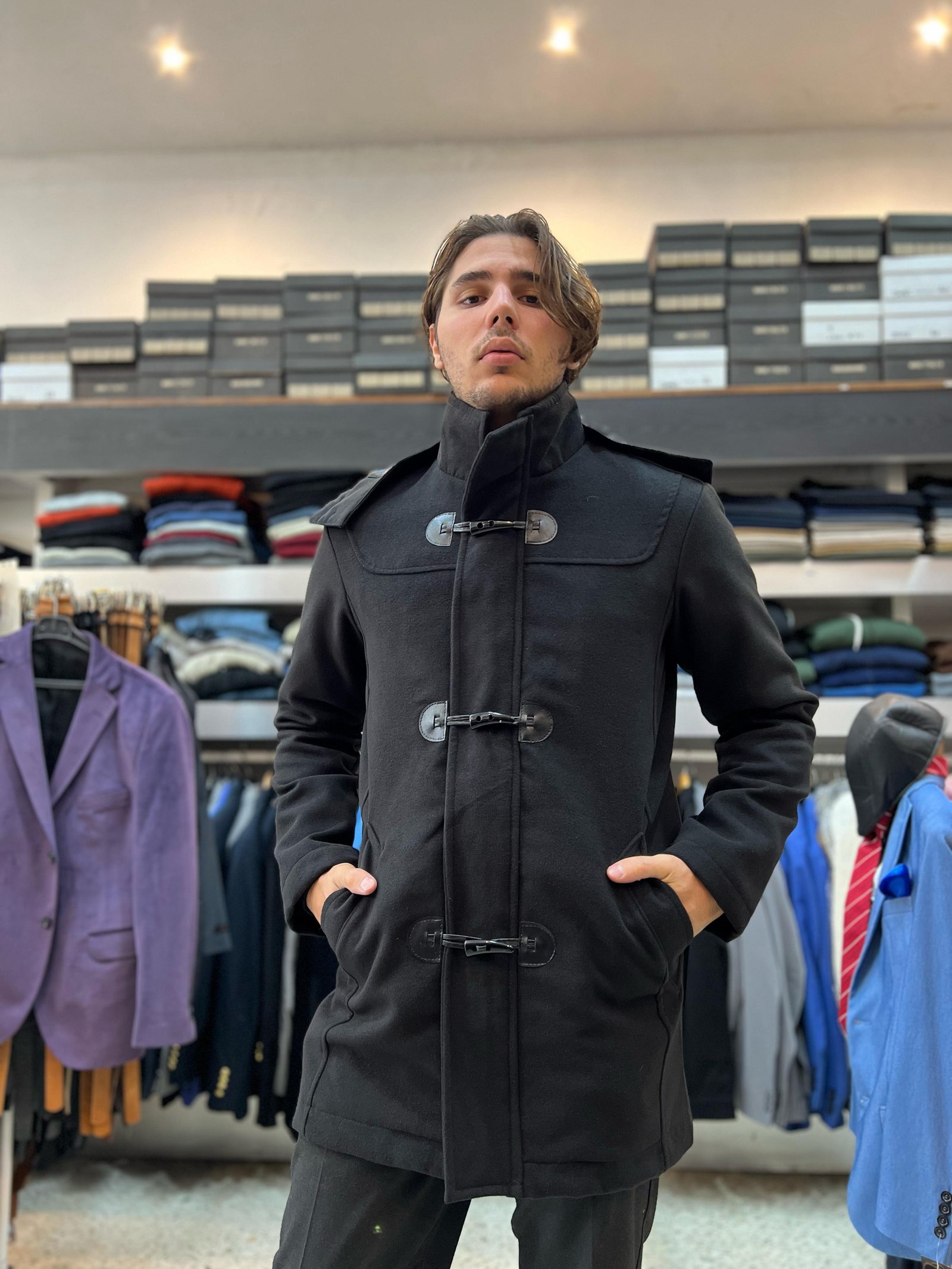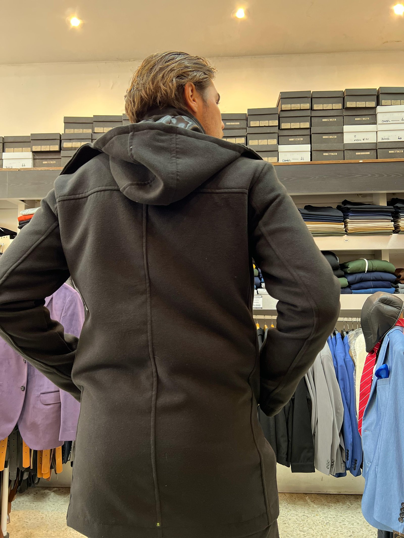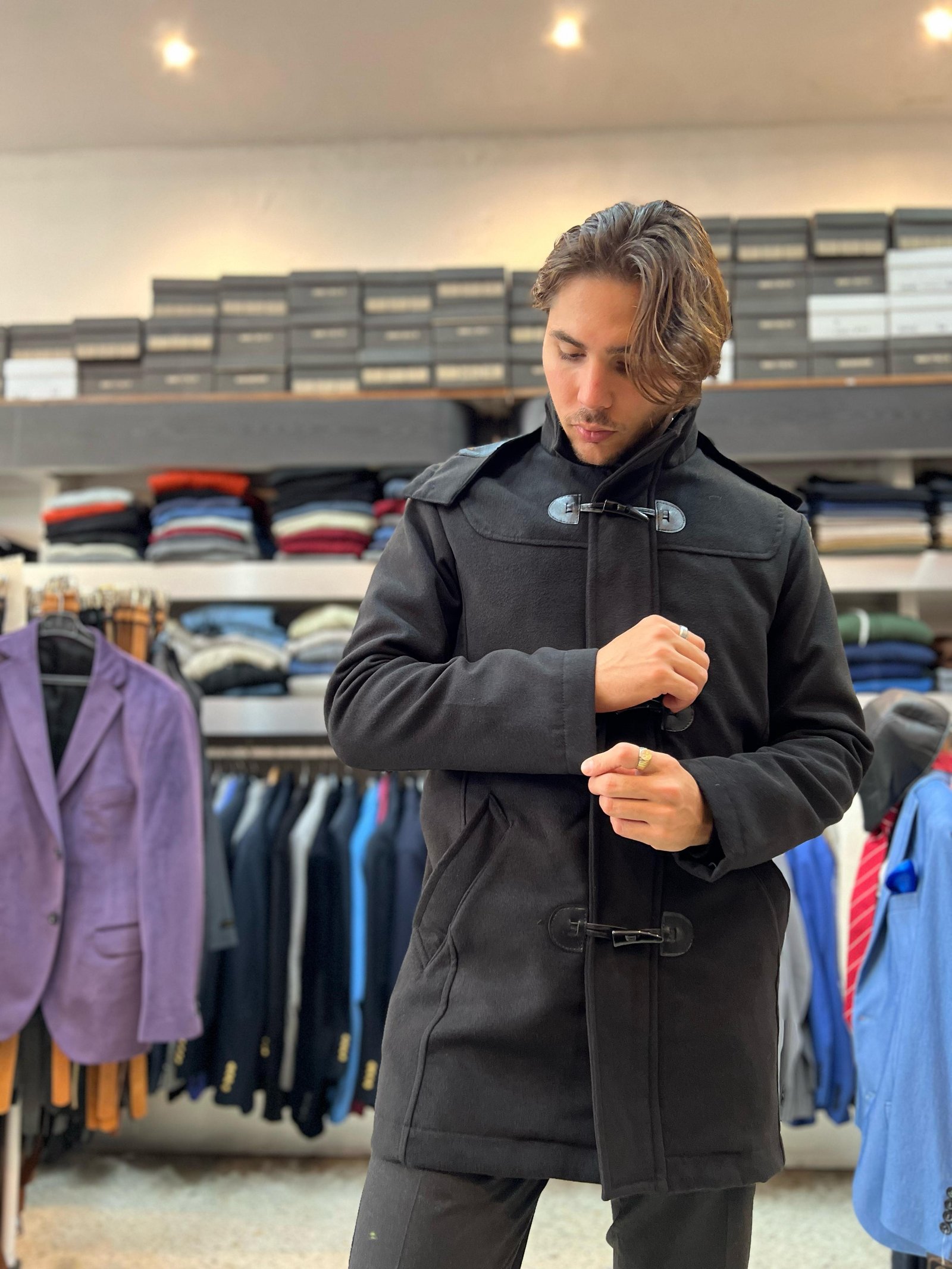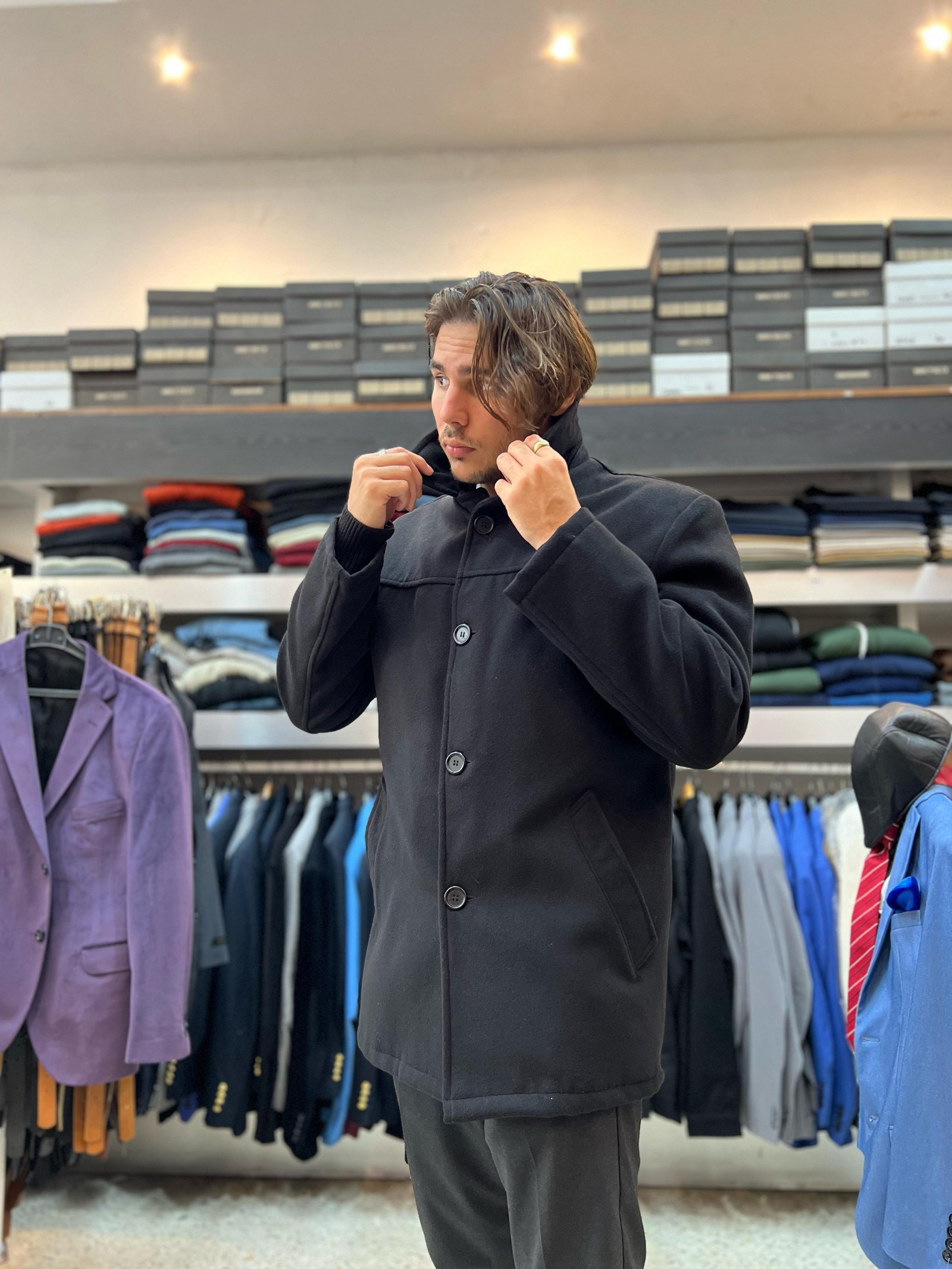 Abrigo negro clásico para hombre, ideal para sumar abrigo, elegancia y versatilidad en los meses fríos. Disponible en Bruno’s Rosario con asesoramiento personalizado y muy buena presencia para vestir.
