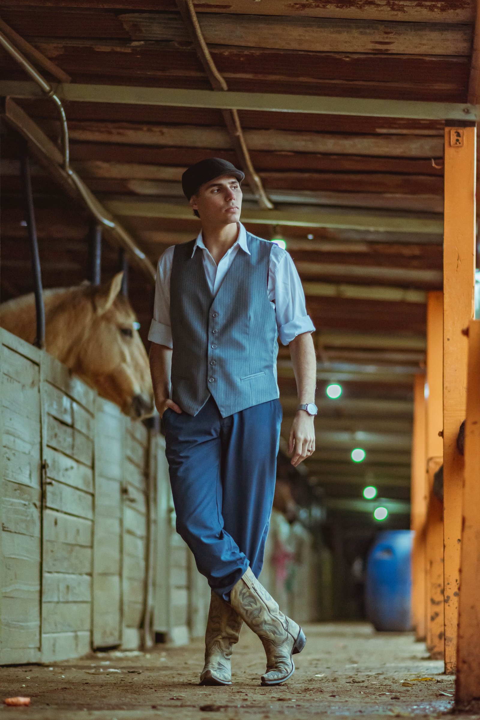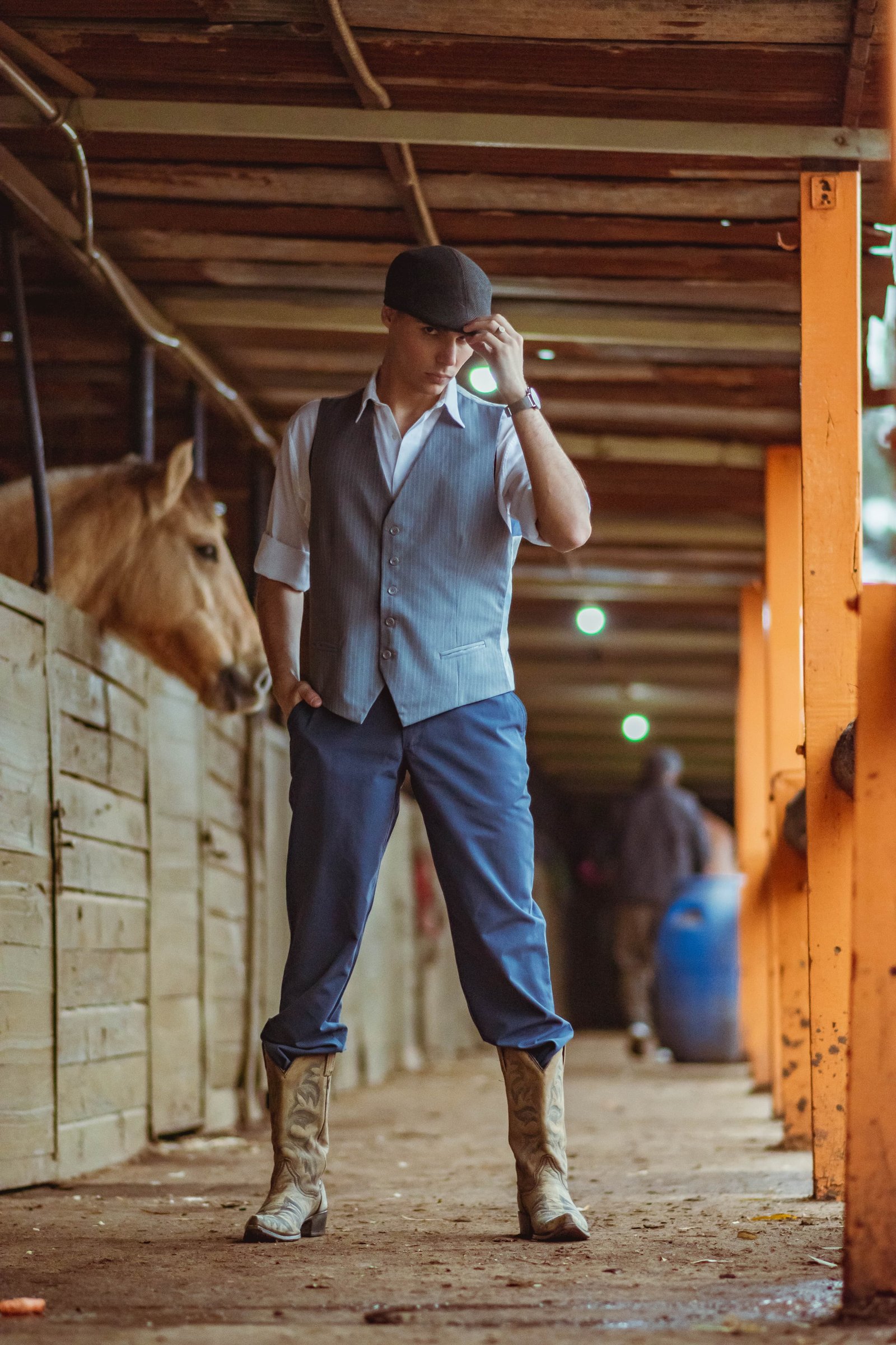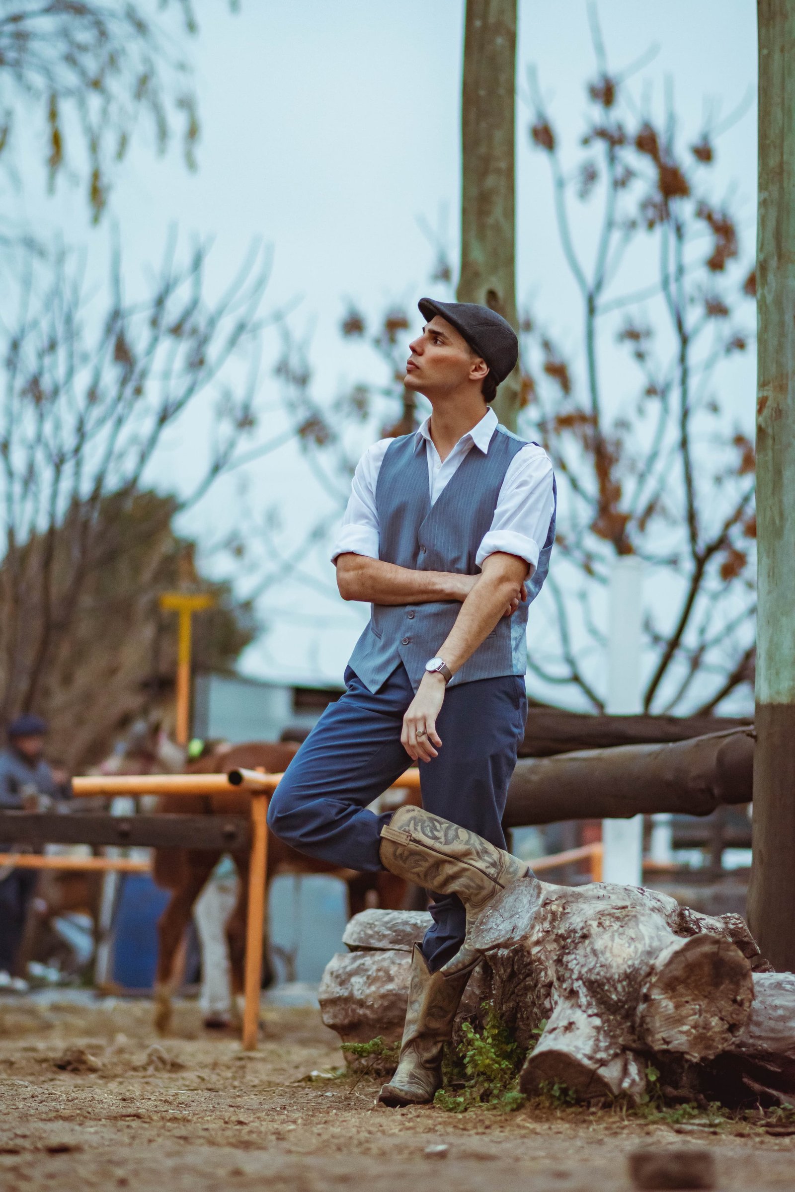 Este chaleco de vestir aporta una identidad marcada a cualquier look masculino. Su estética rayada en tono celeste lo vuelve ideal para quienes buscan una propuesta distinta, con un guiño campestre o una imagen más jugada para sesiones, eventos temáticos y combinaciones de estilo propio.